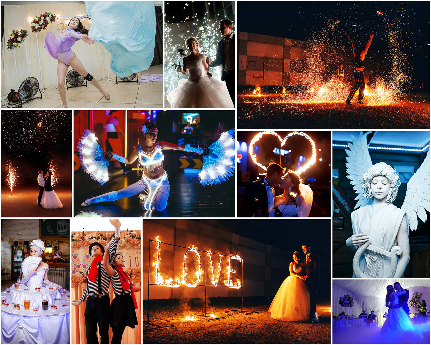 Живые статуи, фейерверки, пиротехническая дорожка, конфетти-пушка, тяжелый дым и многое другое от надежной компании. Большое вам спасибо за четкую и слаженную работу.