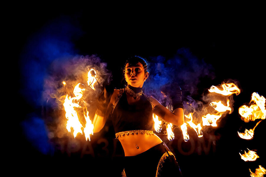 Вверх поднимаются тысячи огненных искр на высоту нескольких метров, на минуту погружая зрителей в атмосферу сказки.