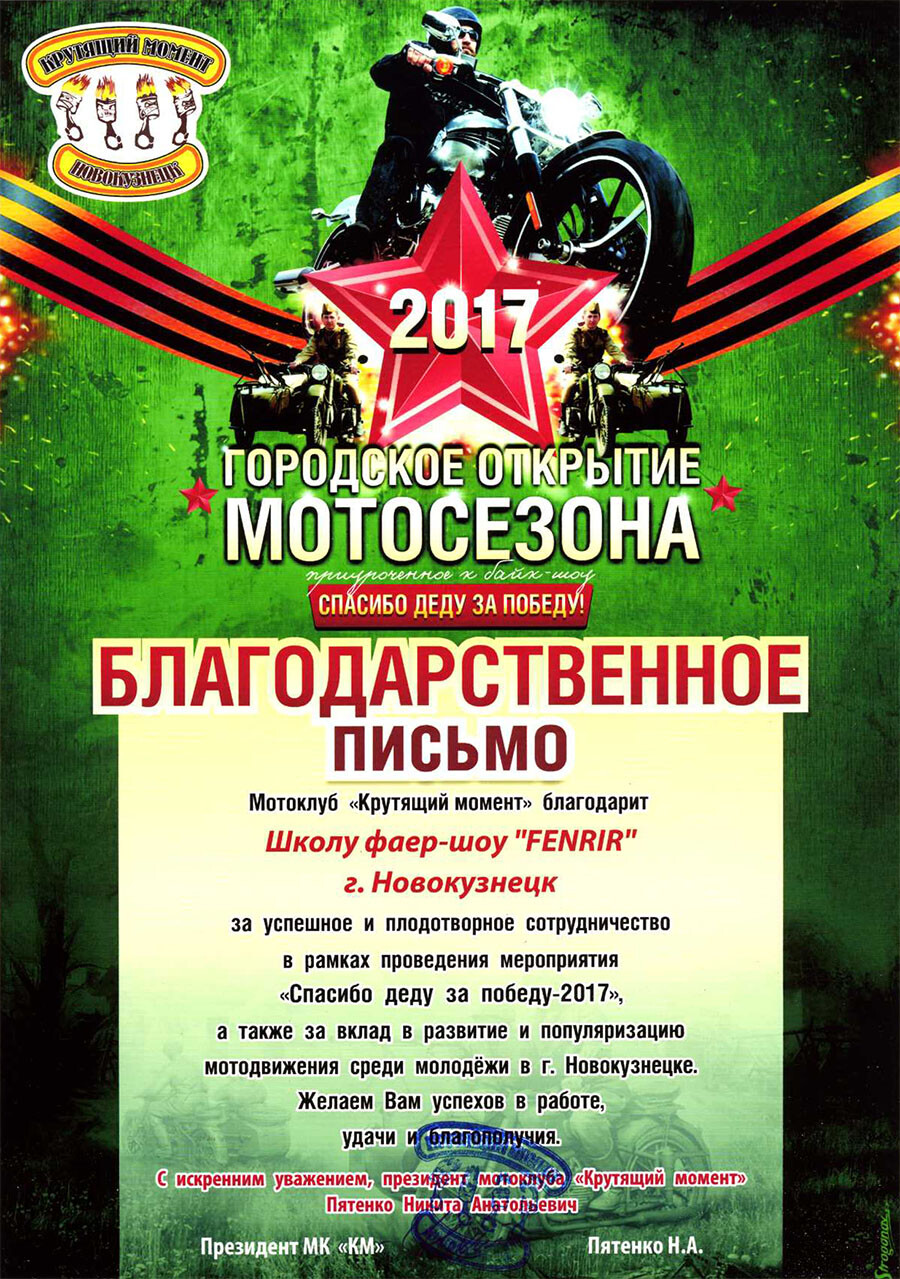 Огромное спасибо Шоу-Проекту FENRIR за отличное Фаер шоу на городском открытии мотосезона! Вы, настоящие профессионалы и умеете подарить массу впечатлений и хорошего настроения зрителям . С нетерпением ждём следующих новых выступлений))